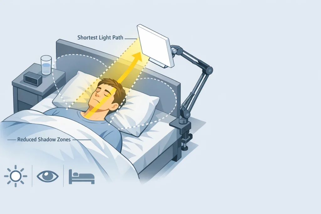 これでは寝返りを打った瞬間に効果が途絶えます。 推奨されるのは、アームスタンド等を用いて「顔の上方(斜め前45度付近)」から見下ろすように照射することです。